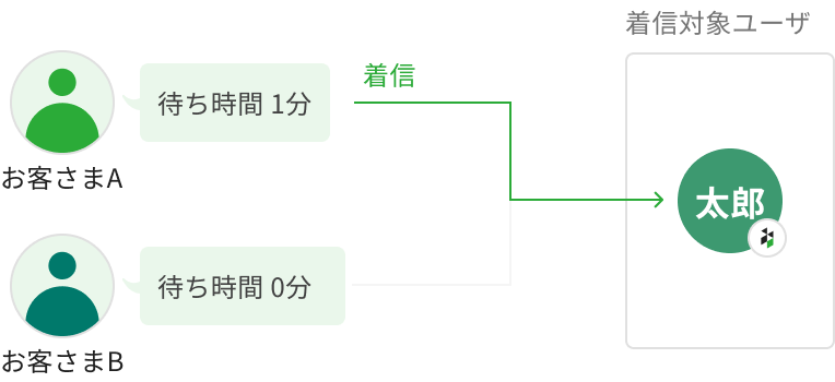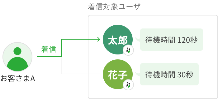 ・お客様から入電した際、ステータスが[受付中]のユーザのうち、待機時間(※)の長いユーザに着信します。