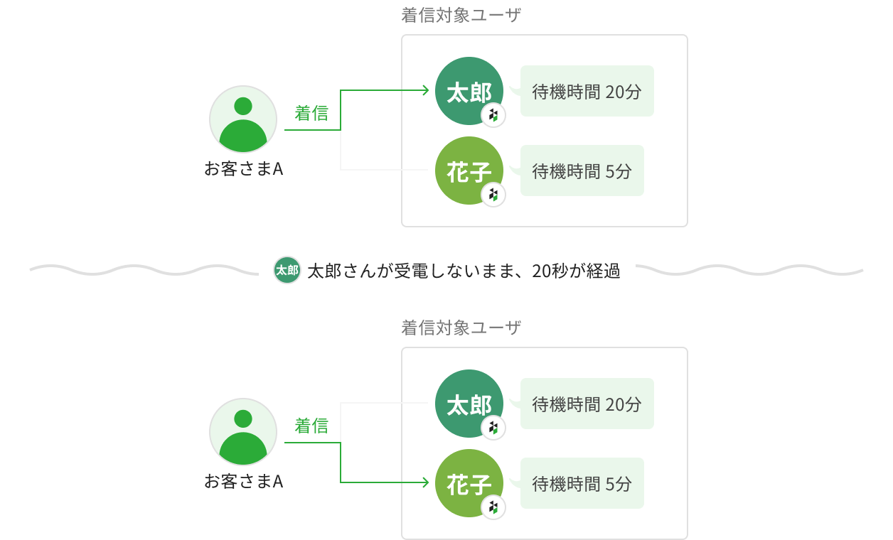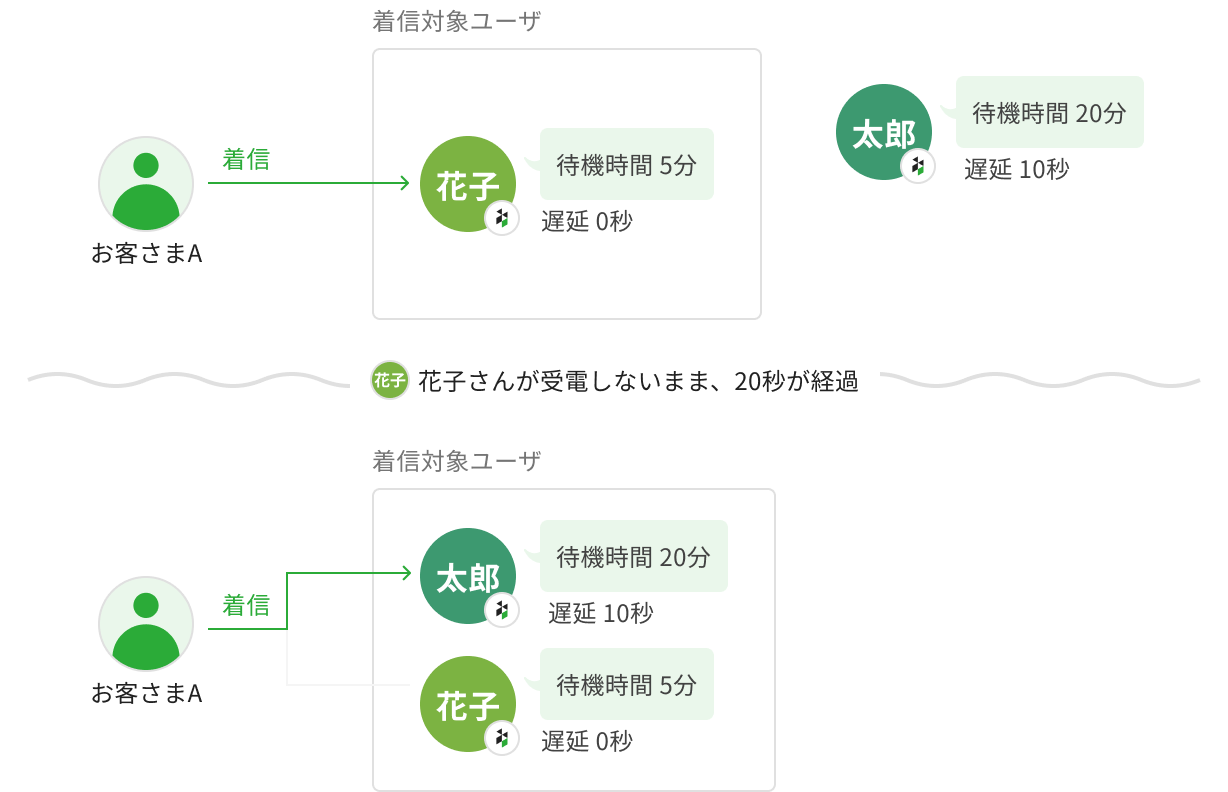 ・最初に着信したユーザが20秒間受電せず、入電してから指定秒数が経過した場合、該当ユーザも着信対象となります。