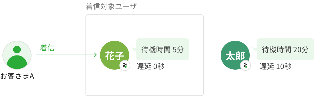 例)遅延とは・前項の通り、デフォルトの設定では「待機時間の長いユーザ」から順に着信します。