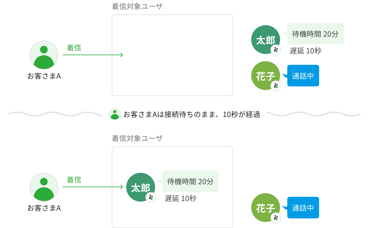 例)⇒この場合、お客様から入電してから10秒が経過するまでは、太郎さんは着信対象となりません。
