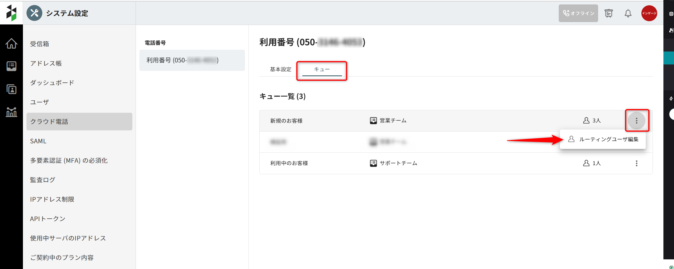 2.「キュー」タブを選択し、優先度を設定したいキューのメニューアイコンから[ルーティングユーザ編集]を選択します。