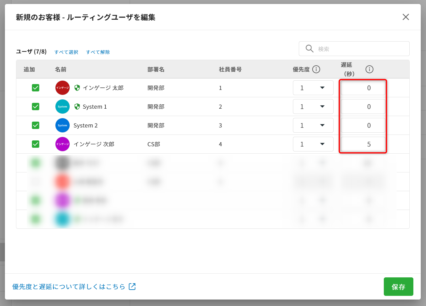 3.キューに紐づいているユーザ一覧が表示されるため、各ユーザの遅延を設定し、保存します。