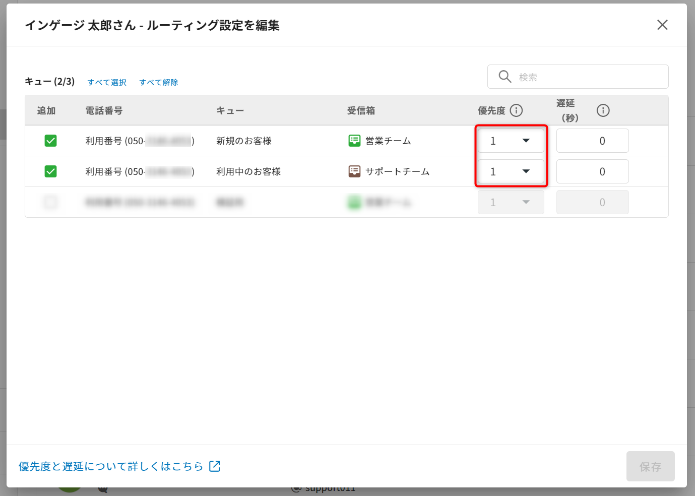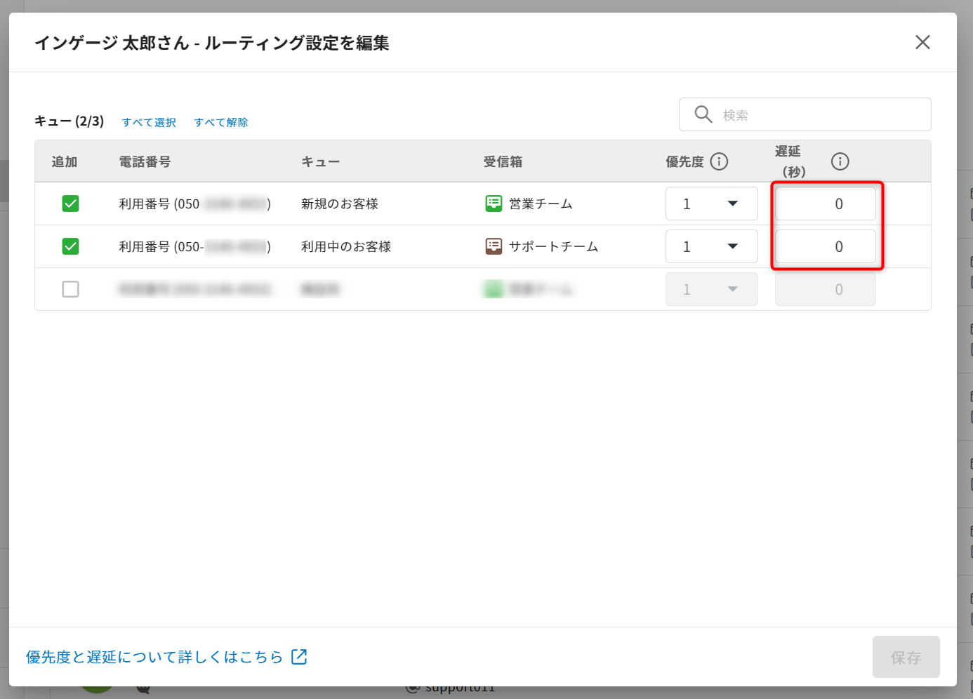 各キューの遅延を設定し、保存します。複数のキューの電話を対応する場合電話機能を利用するユーザは、ルーティング設定にてキューの割り当てを行うことで、着信を受けることができます。