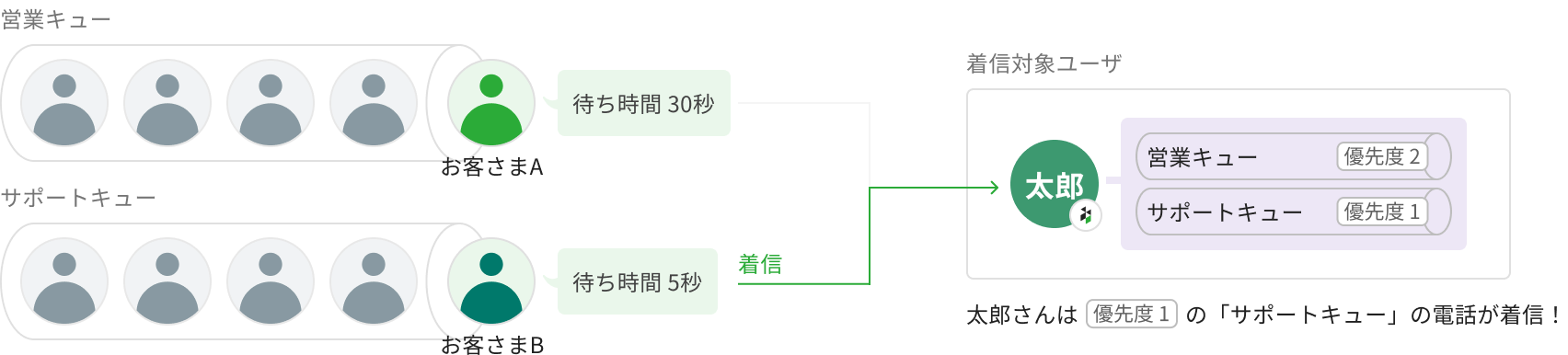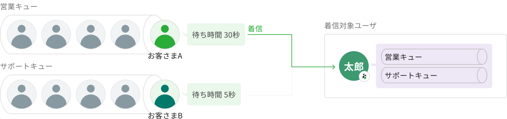 ・複数の窓口にお客様から入電した際、ユーザに割り当てられているキューのうち、お客様の待ち時間が長い電話が着信します。