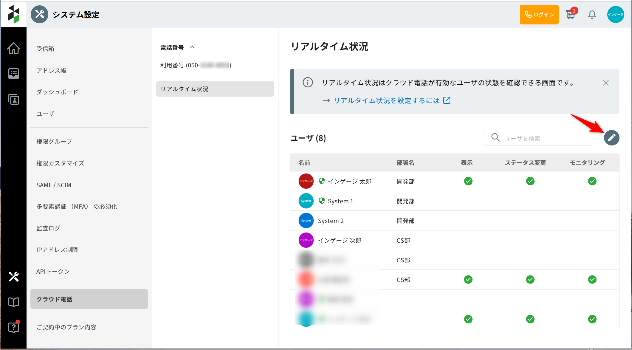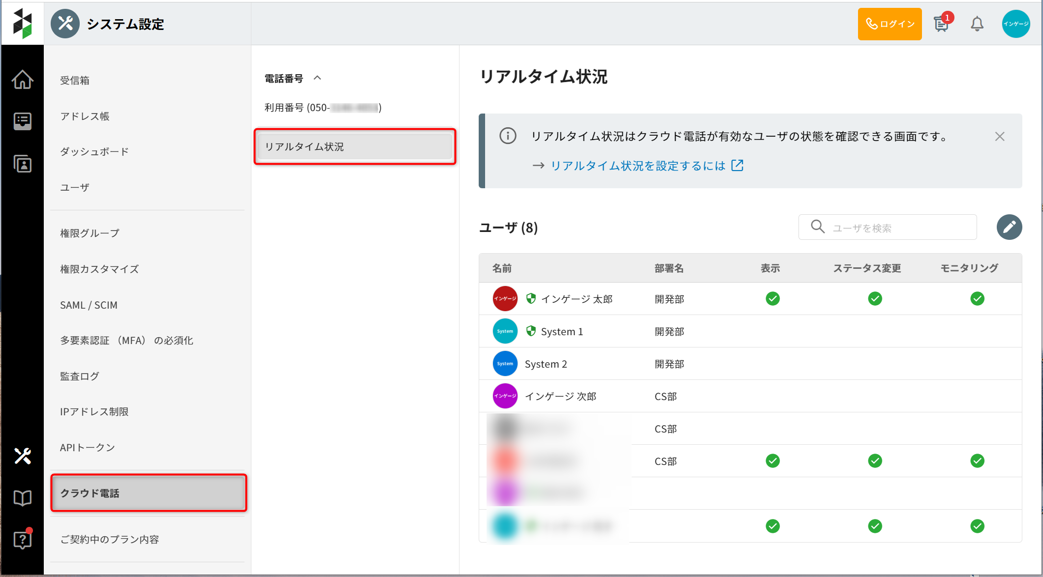 ・リアルタイム状況の使用許可は、 アカウントオーナーのみ可能です。リアルタイム状況を確認することで、クラウド電話の現在の利用状況を把握することできます。