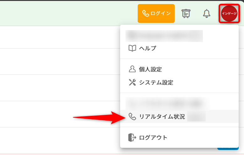 ・モニタリング:通話中、保留中ユーザの通話を聞くことが可能リアルタイム状況を使用するには1.画面右上ログインユーザアイコンより「リアルタイム状況」を選択します。