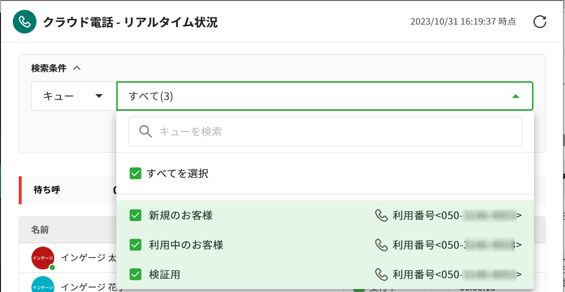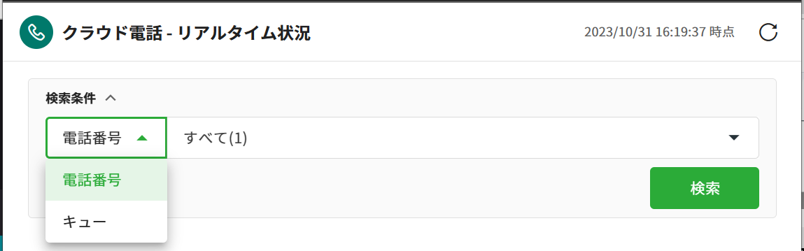 3.[検索条件]にて電話番号やキューごとに絞り込みも可能です。