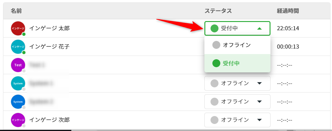 4.ユーザのステータス変更が許可されている場合、ステータスのプルダウンにて[受付中/オフライン]に切り替え可能です。ご注意