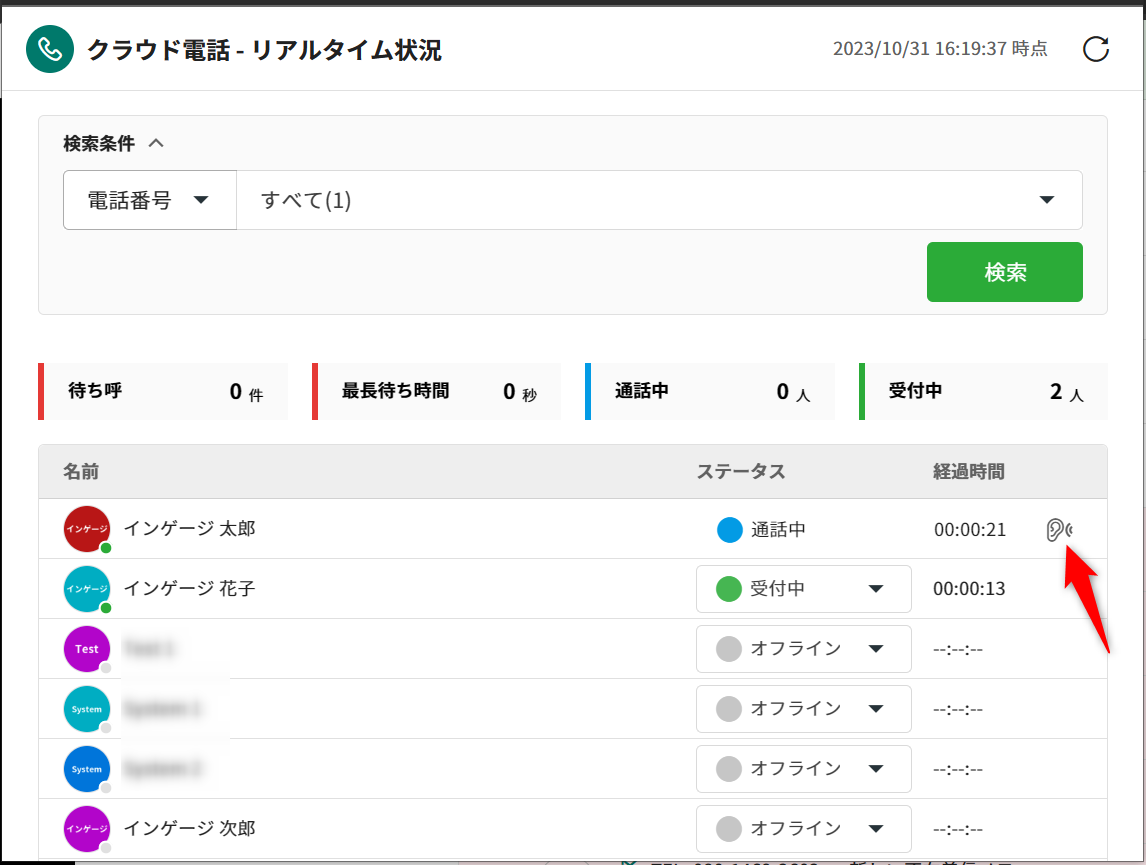 ユーザのステータス変更が許可されている場合、モニタリングアイコンを押下すると通話内容をリアルタイムに確認可能です。