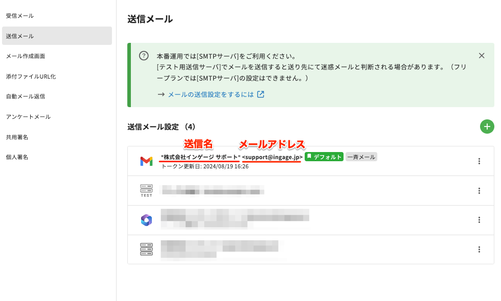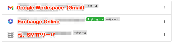 一斉配信で使用できるメールアドレスとして選択できるのは、「SMTPサーバ」「GoogleWorkspace(Gmail)」「Microsoft Exchange Online(Office 365)」 のみです。