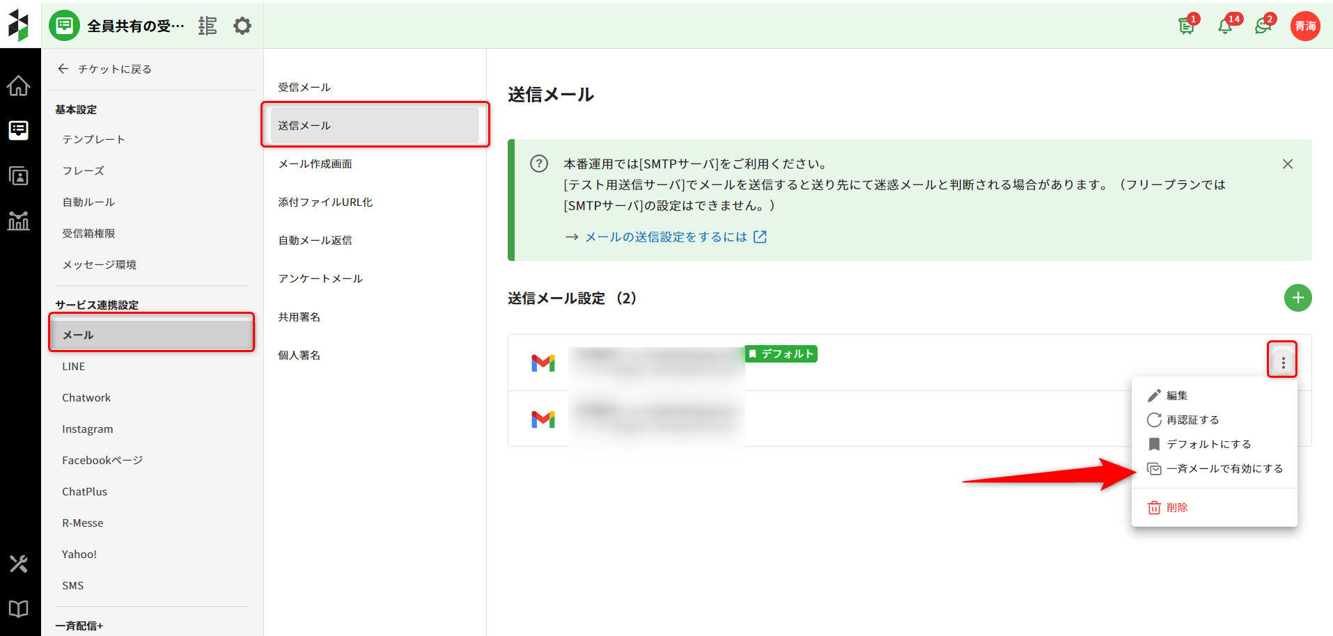 2.[メール] - [送信メール] を選択し、一斉配信で使用したいメールアドレスの右端にあるメニューアイコンより、[一斉メールで有効にする]を選択します。