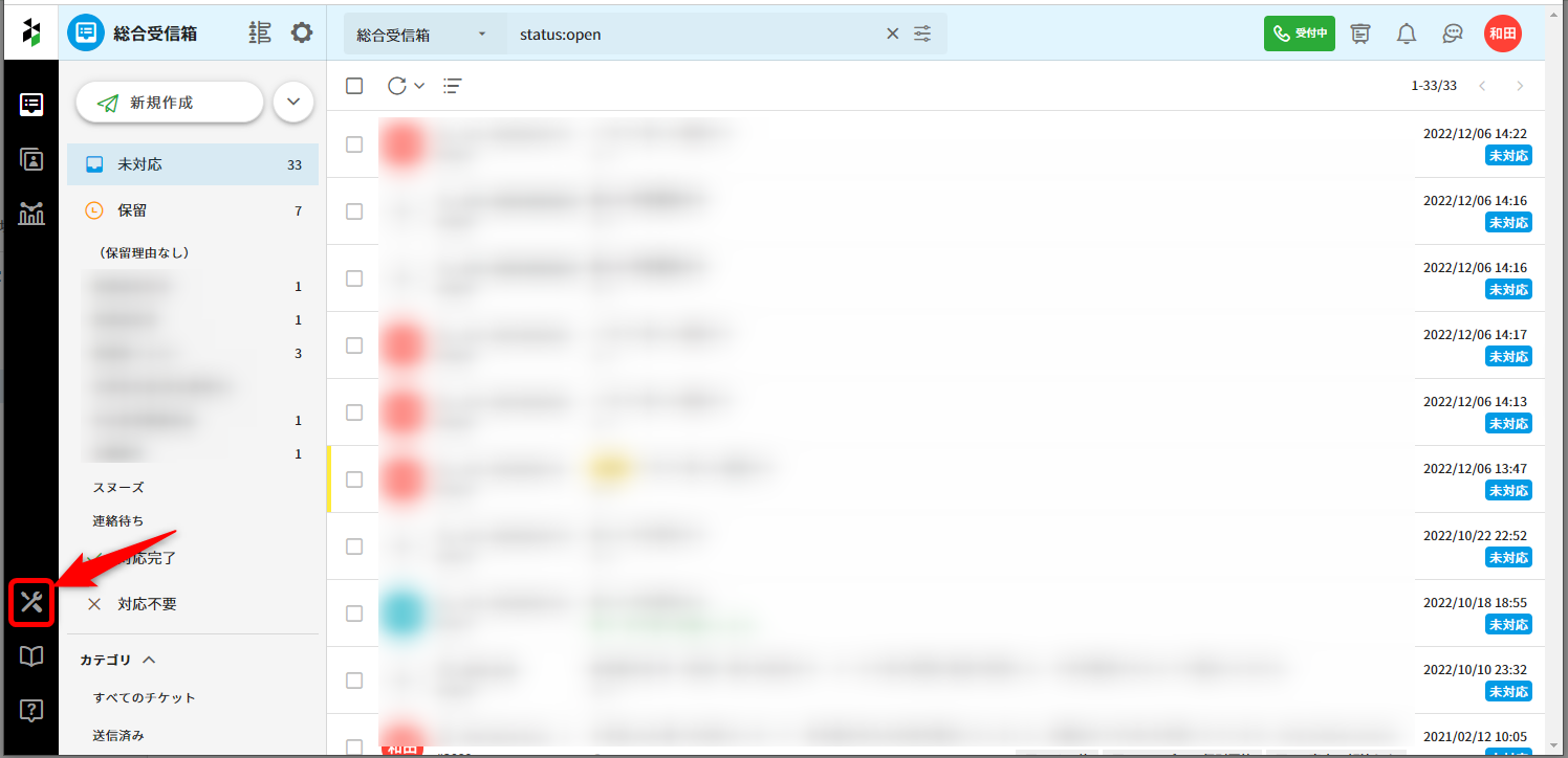 または、グローバルナビゲーションバー(画面左側の黒いバー)の受信箱アイコンより、任意の受信箱のギアアイコンをクリックします。