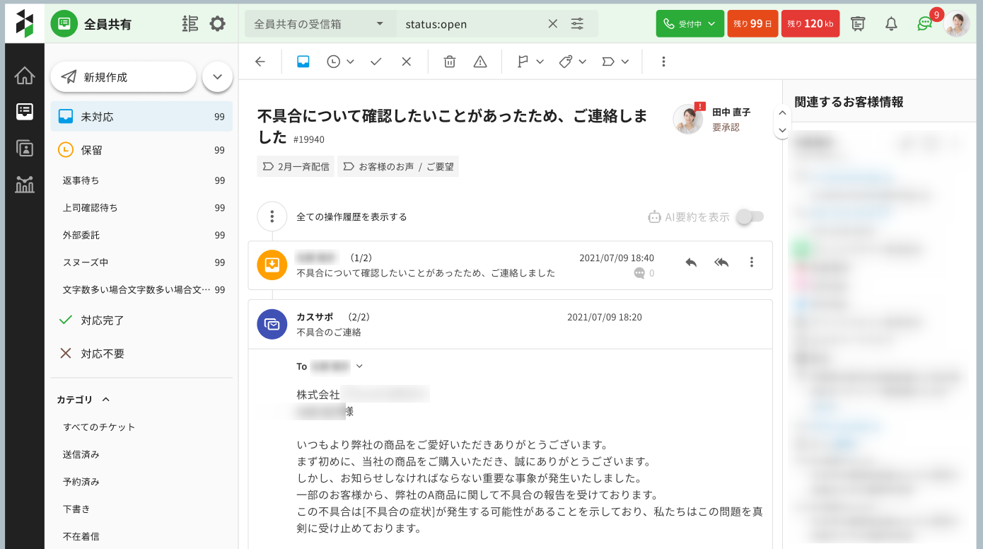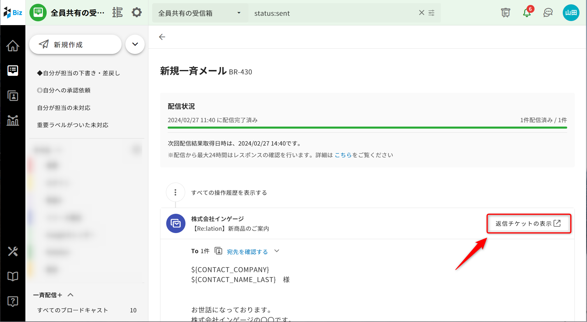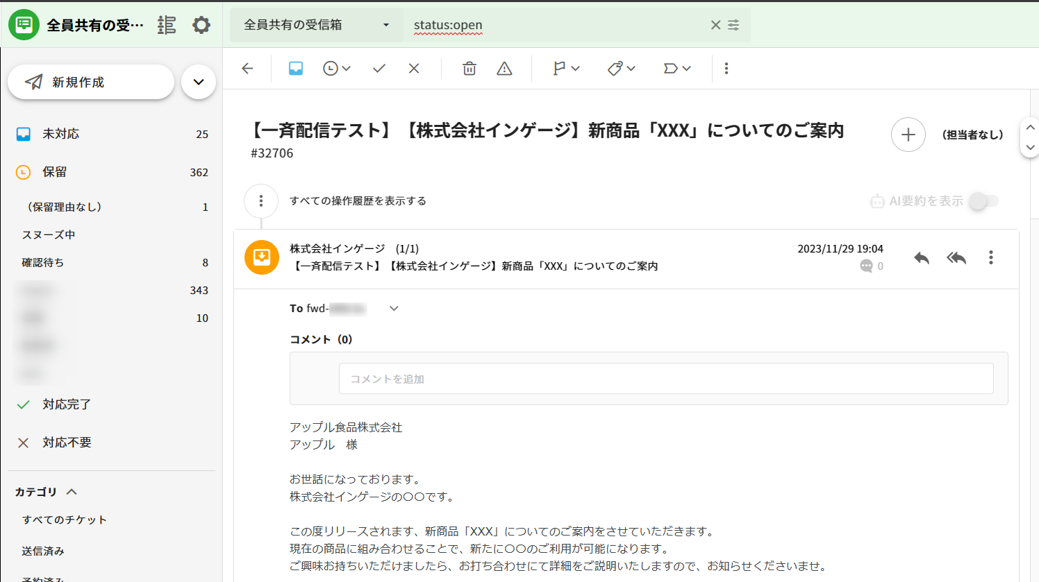4.ブロードキャストを作成した受信箱のチケット一覧にて、テスト送信メールが受信されます。