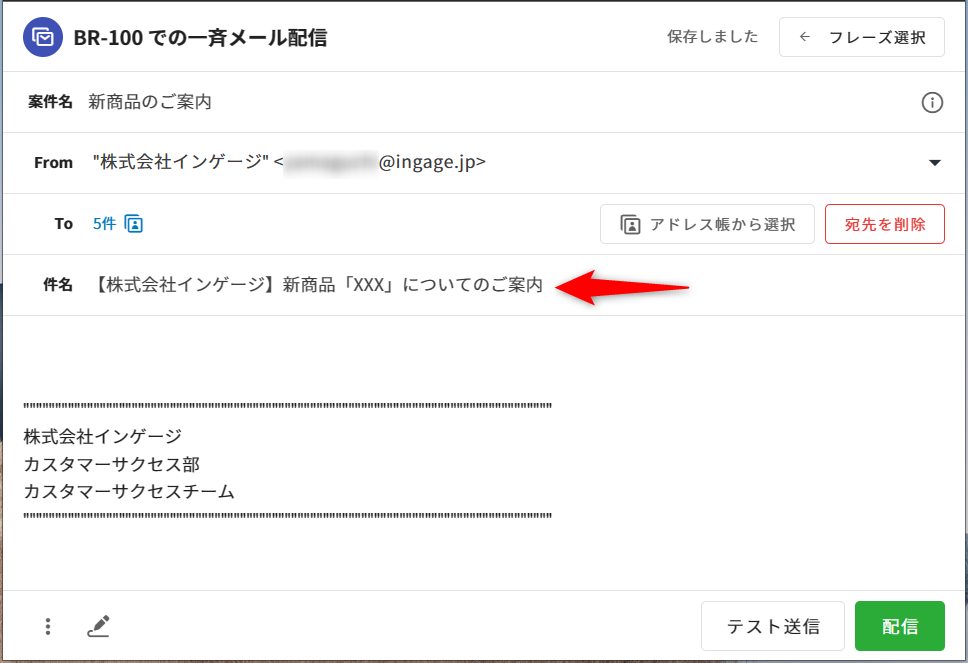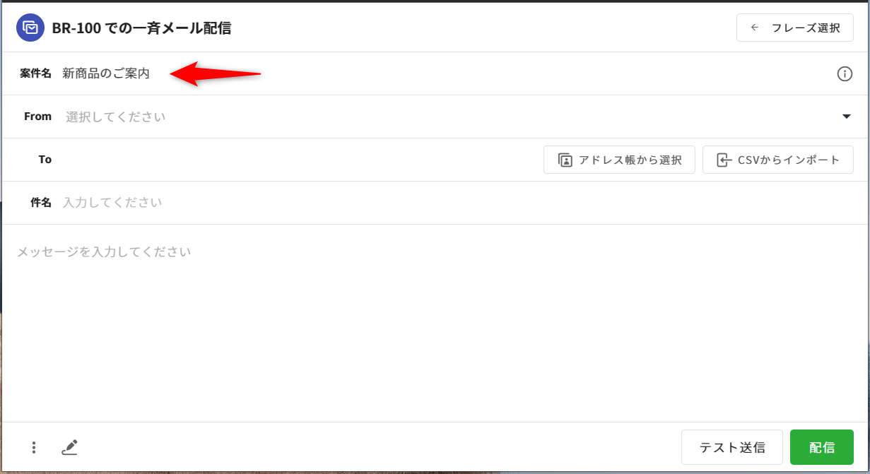 5.[件名]の欄は、一斉配信するメールの件名を入力します。
