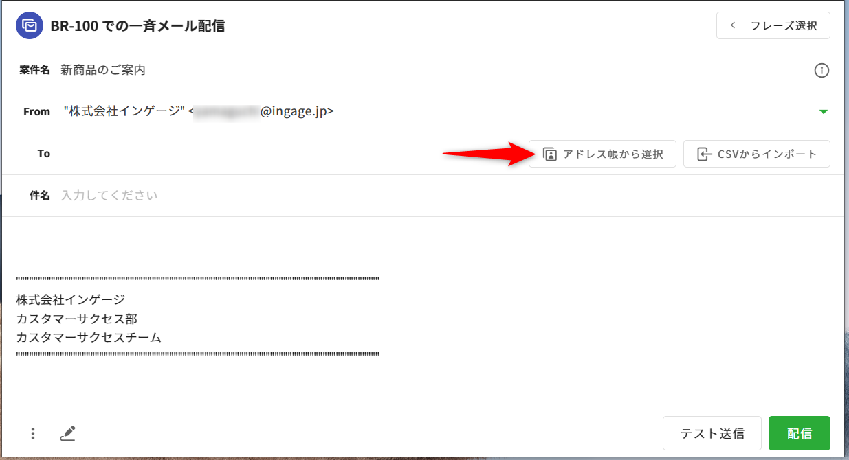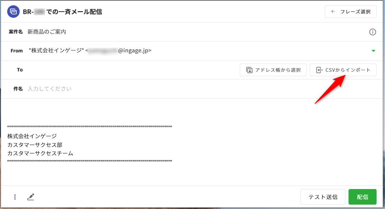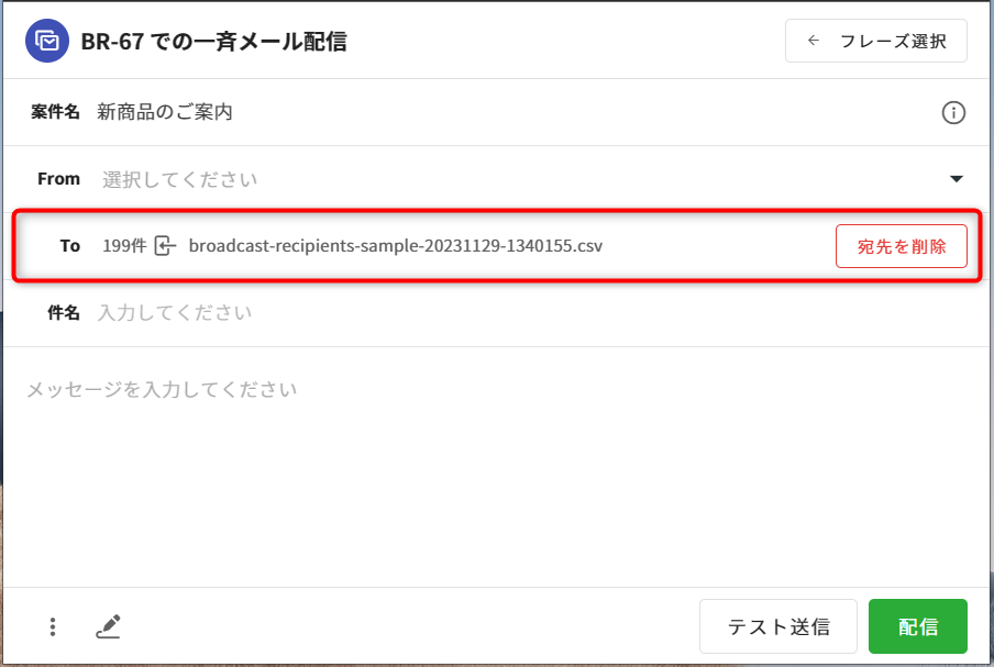 ⑤編集画面に戻ると、インポートした宛先件数とCSVファイル名が[To]欄に表示されます。