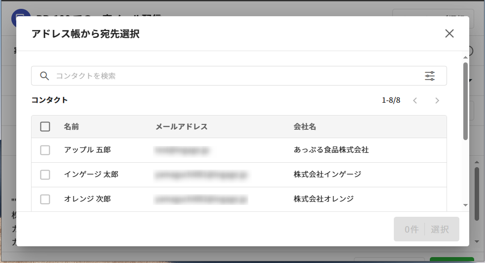 ④検索結果のコンタクトをチェックし、[選択]を押下します。