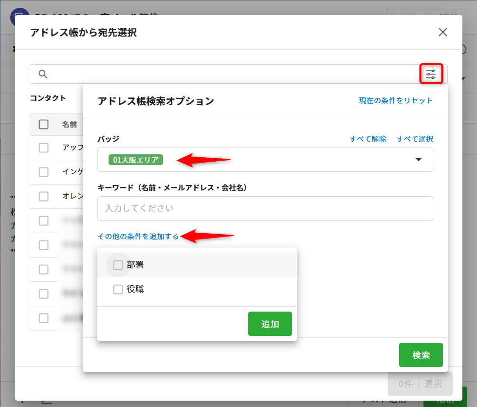 アドレス帳検索オプションにて、バッジやカスタム項目の絞り込みをすることも可能です。