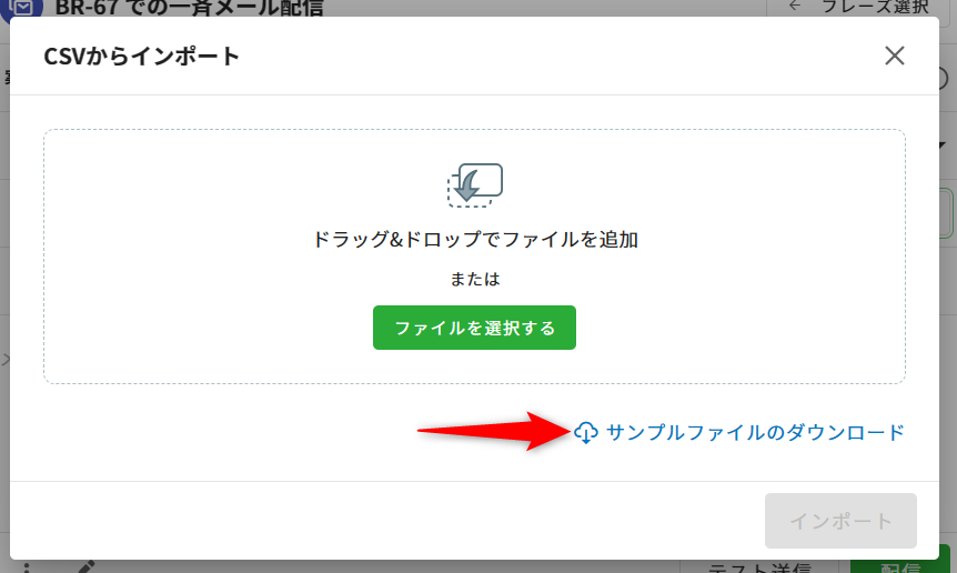 ②アップロード画面が表示され、[サンプルファイルのダウンロード]からCSVのサンプルをダウンロードできます。