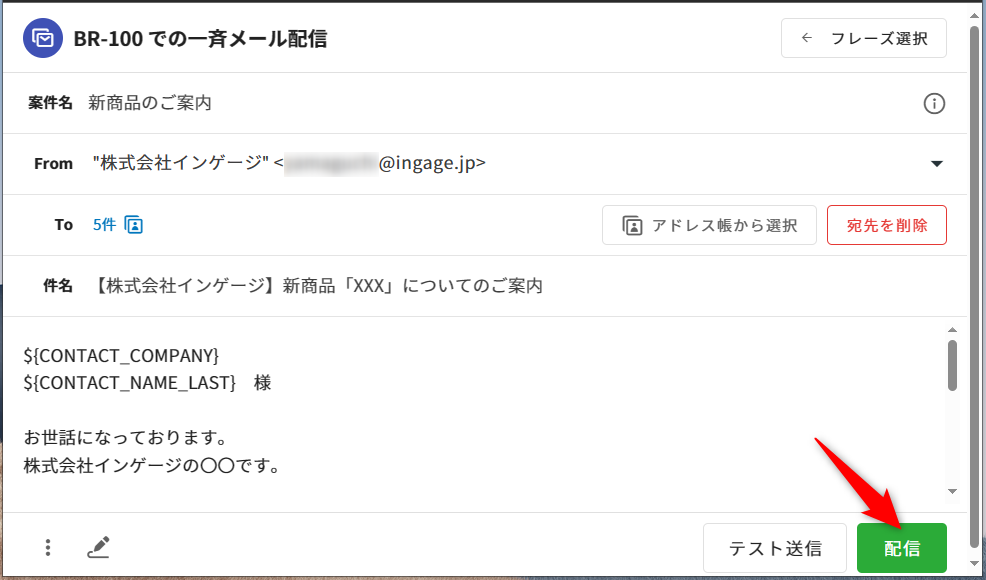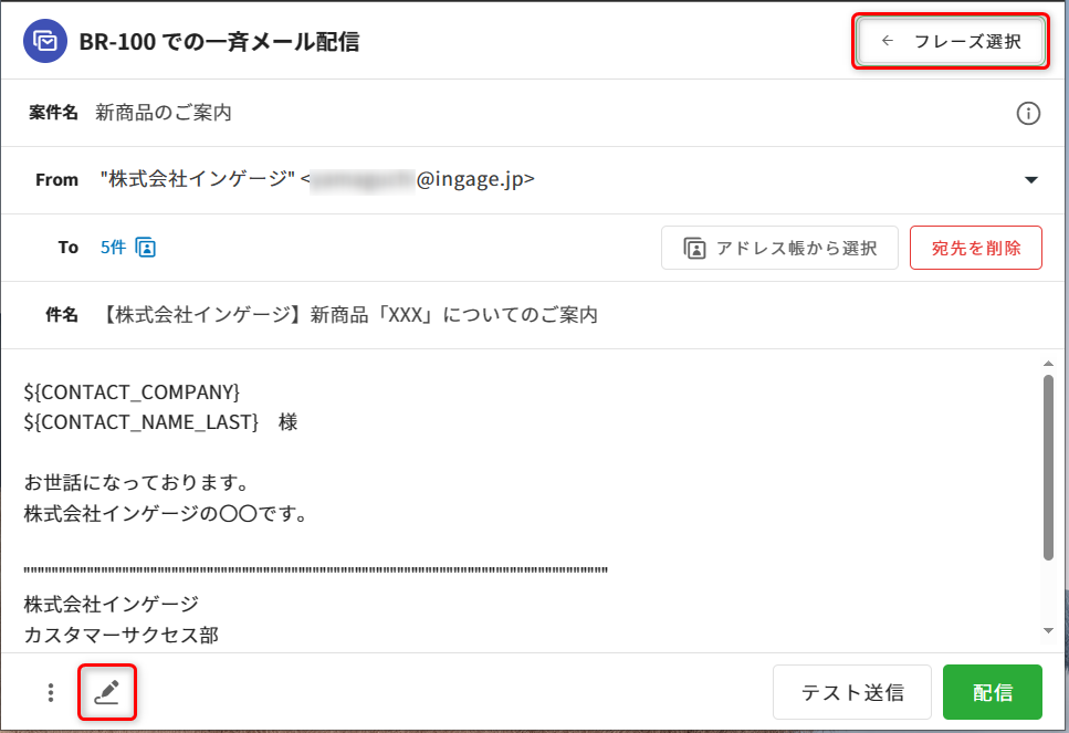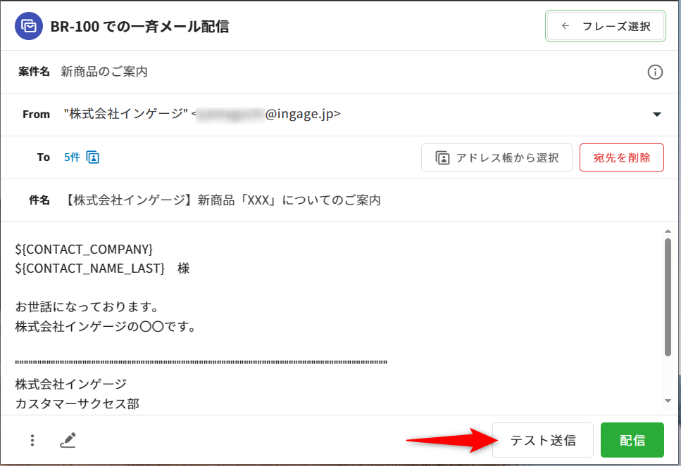 ※フレーズ適用時は置換されないため、内容の確認をするにはテスト送信をお試しください。