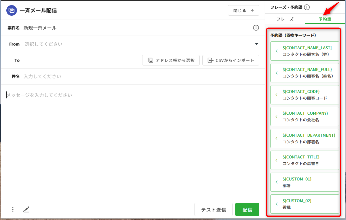 [フレーズを選択]をクリック後、[予約語]をクリックすると一斉配信専用の予約語一覧が表示されます。