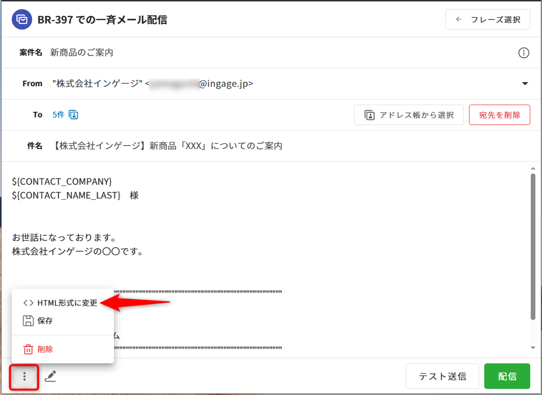 テスト送信をすると、自身の受信箱にてメールが受信されます。1.[テスト送信]を選択します。