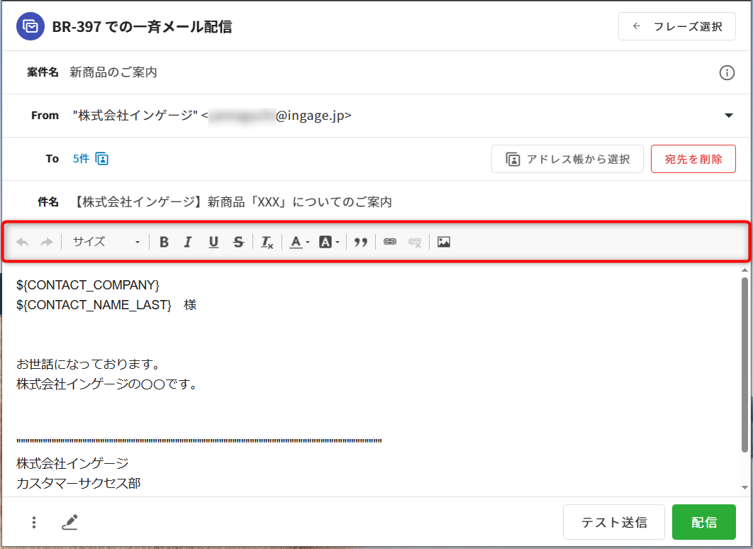 HTML形式の場合、メールの装飾が利用できます。一斉配信の編集画面のデフォルト形式は、「メール作成時の表示形式」のデフォルト設定に応じて選択されます。