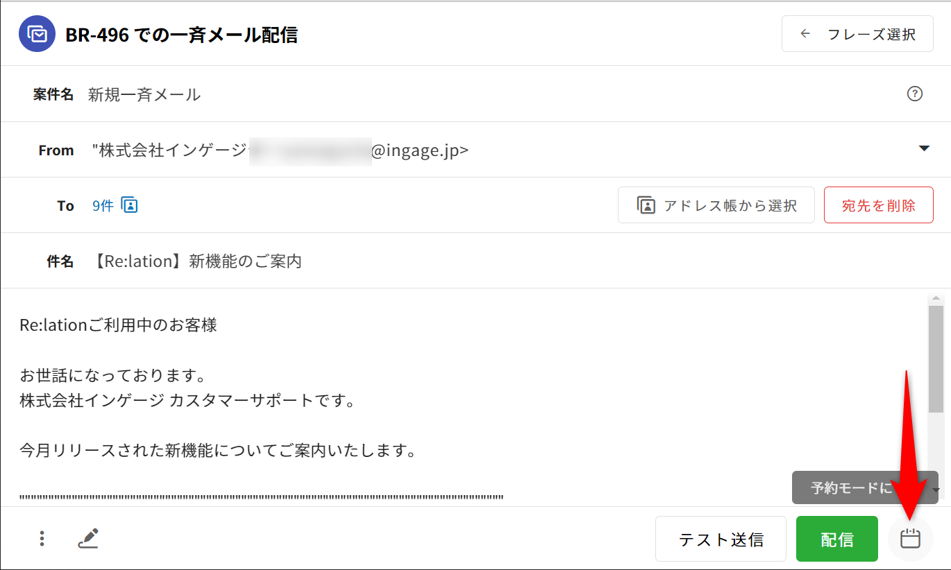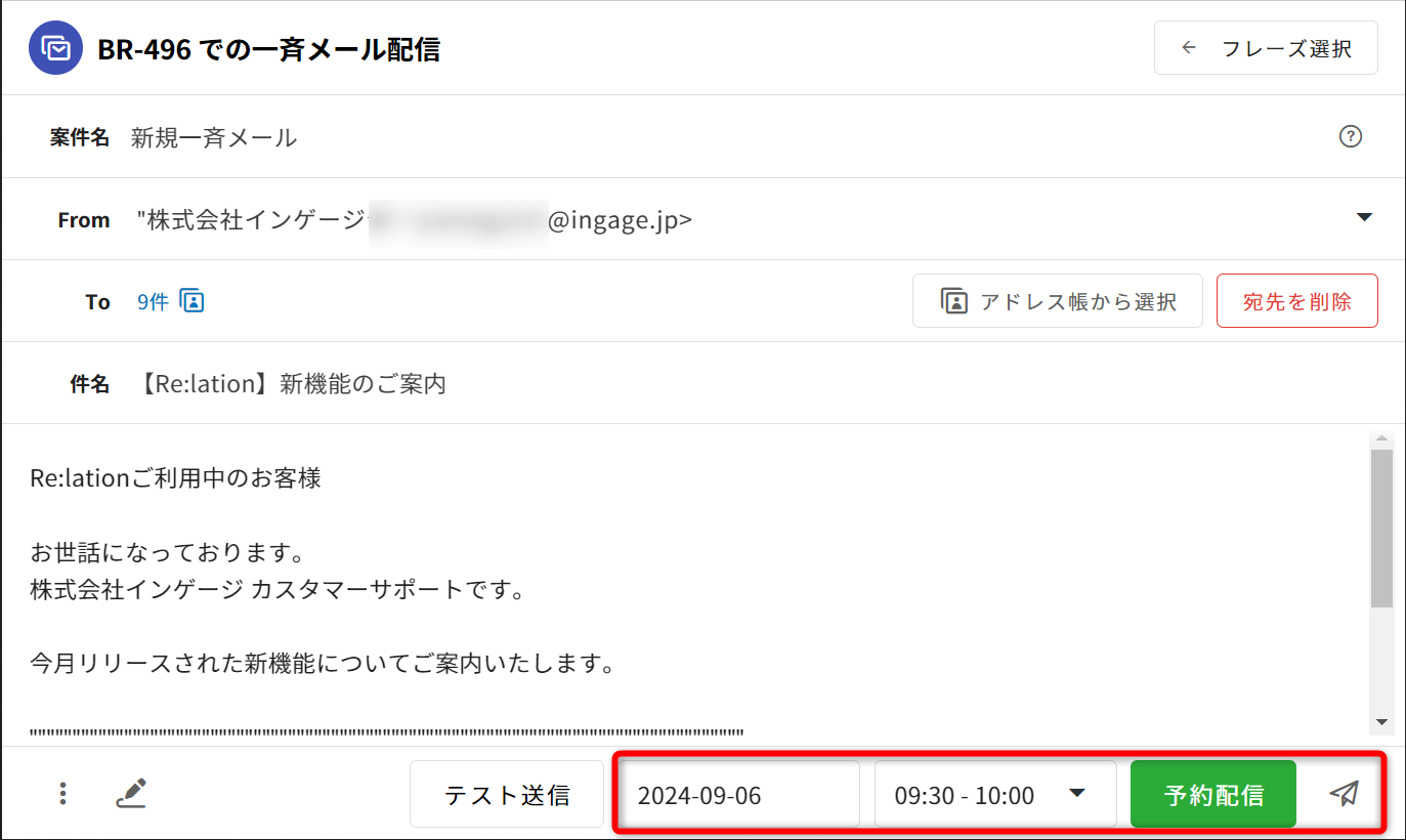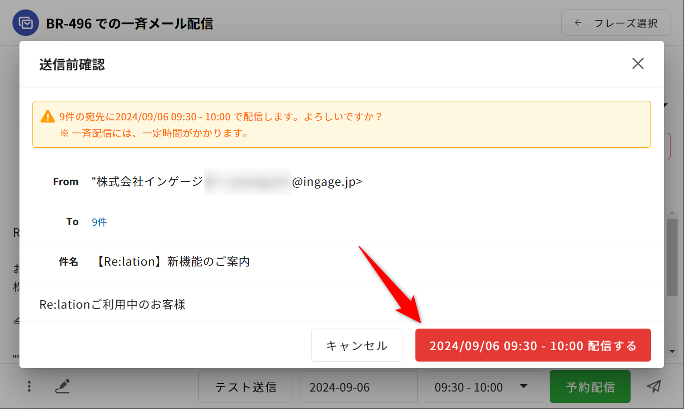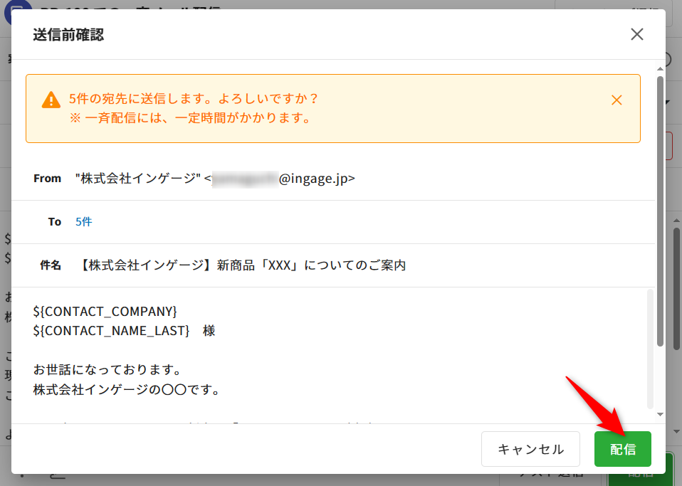 本文や予約語の置換結果など、一斉配信メールの内容に問題がないか確認してください。
