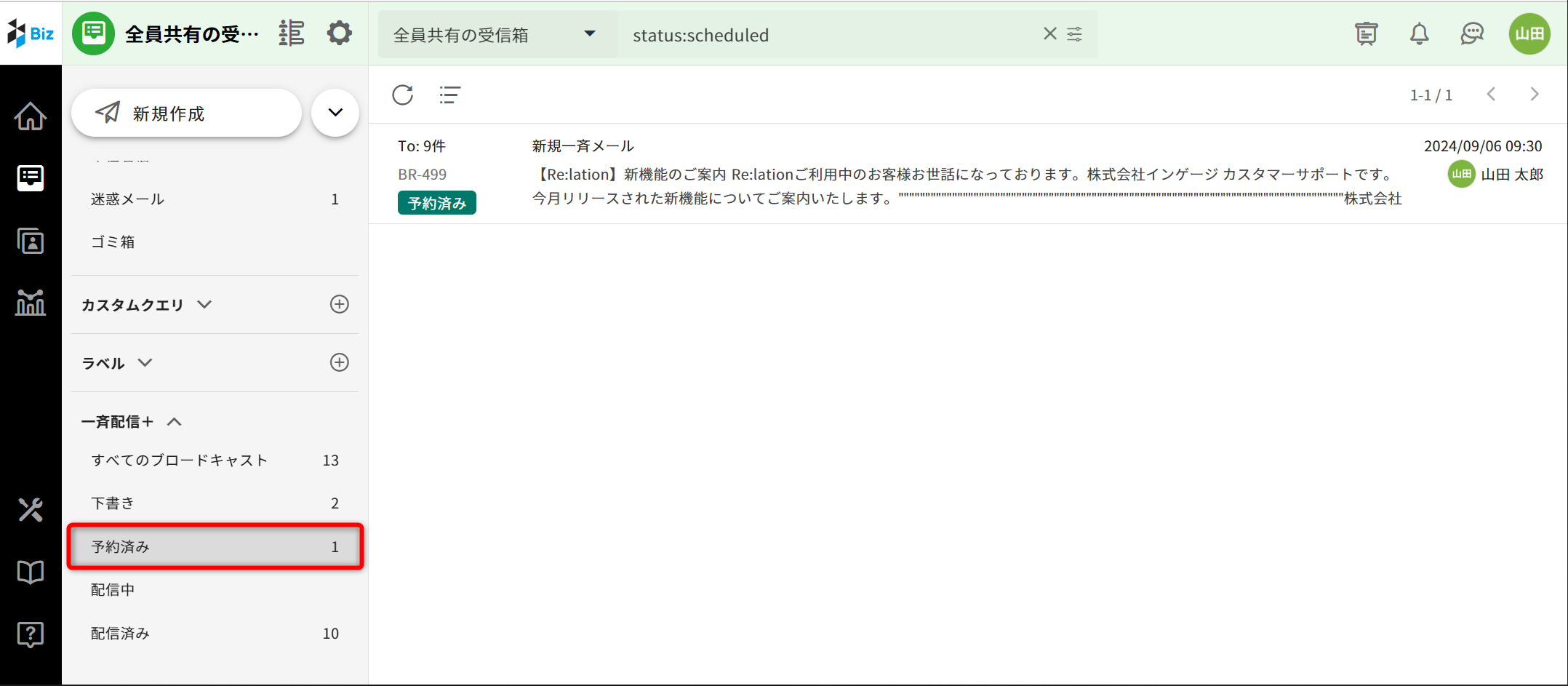 配信予約しブロードキャストは、サイドバーにある[一斉配信+]の[予約済み]をクリックすると確認できます。
