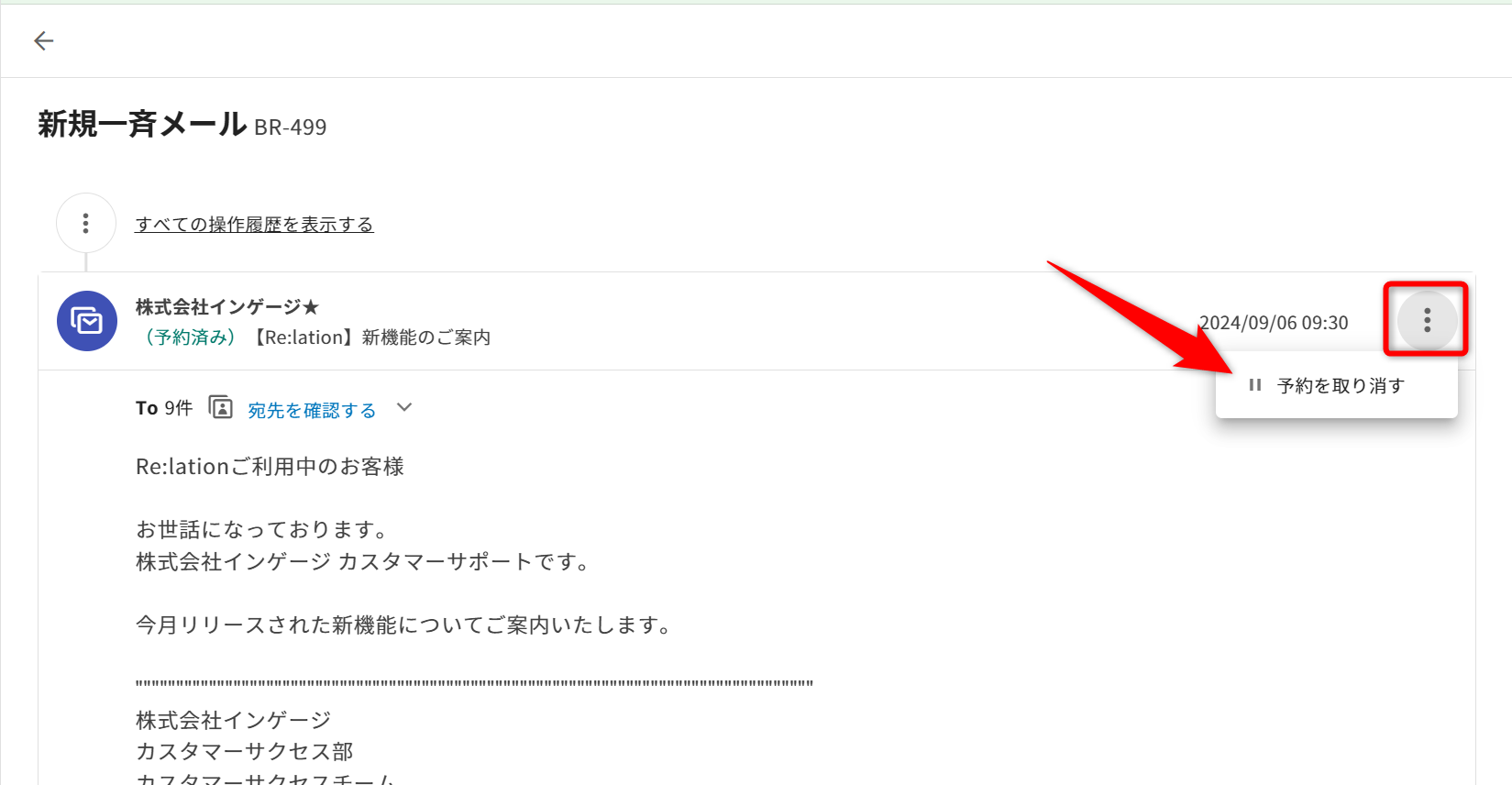 取り消したい配信予約のブロードキャストのメニューアイコンをクリックし、「予約を取り消す」を選ぶと、通常の下書きに戻ります。操作履歴について