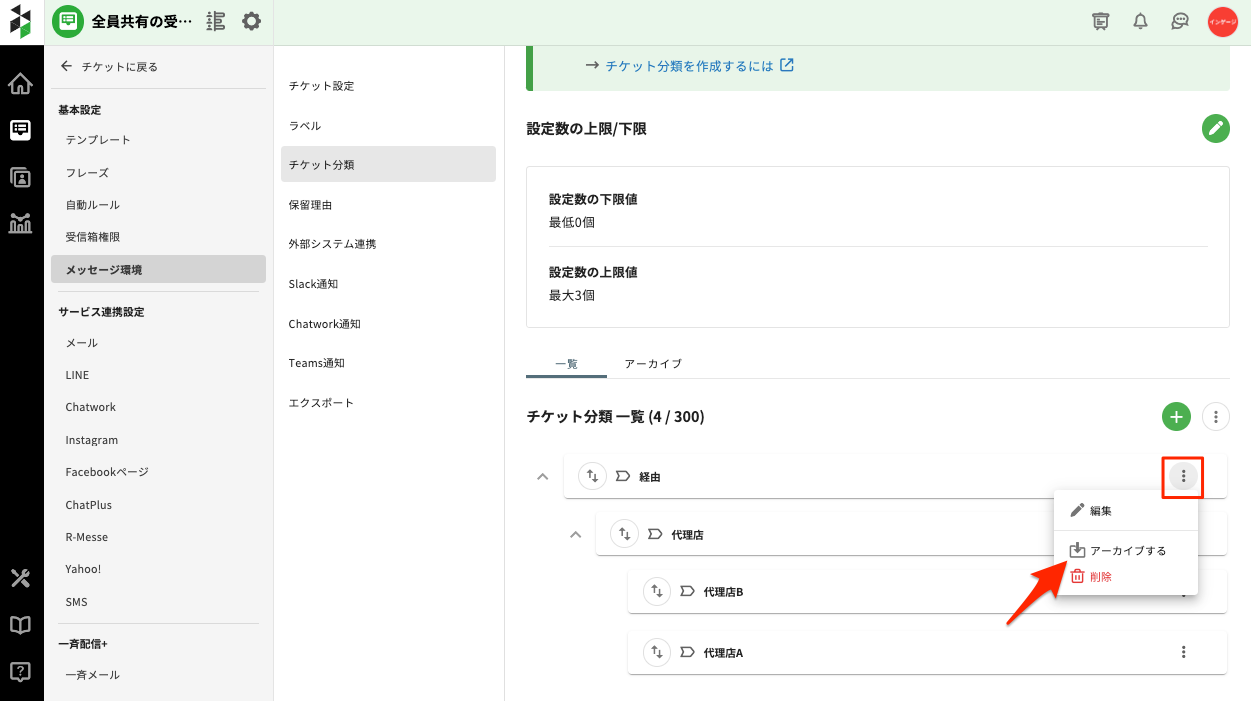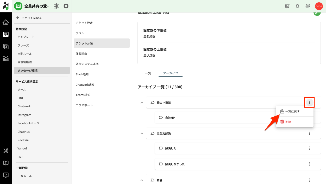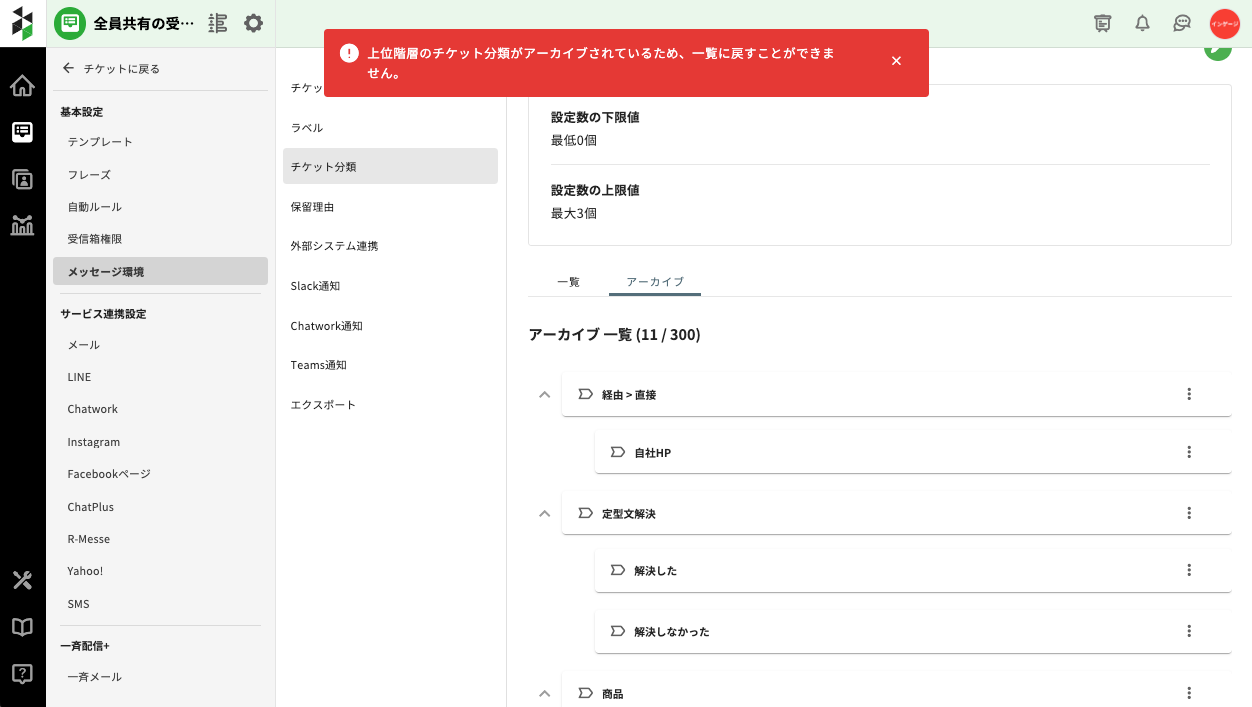1.画面左上の歯車アイコン>[メッセージ環境]>[チケット分類]より、「アーカイブ」一覧を表示します。