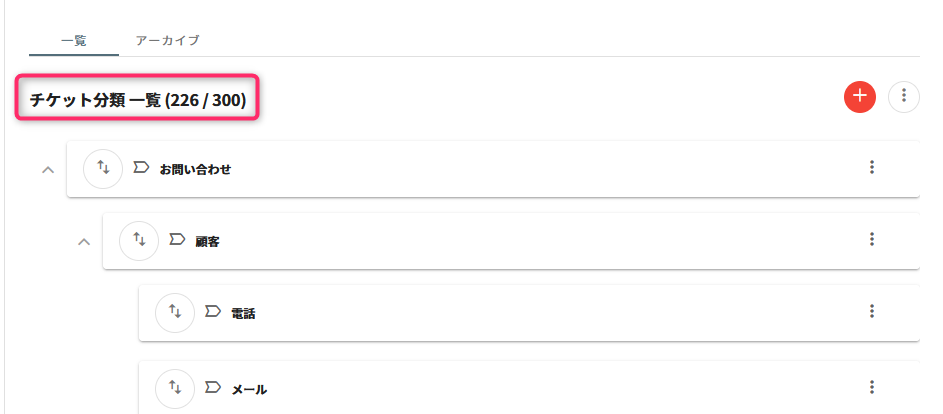 4.アーカイブすると、チケット分類一覧から「アーカイブ」に移動します。また、アーカイブしたチケット分類は『チケット分類一覧』のカウント対象にはなりません。