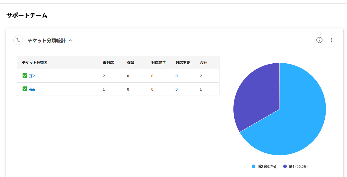 アクティブなチケット分類と同様に、ダッシュボード>「チケット分類統計」レポートで確認できます。