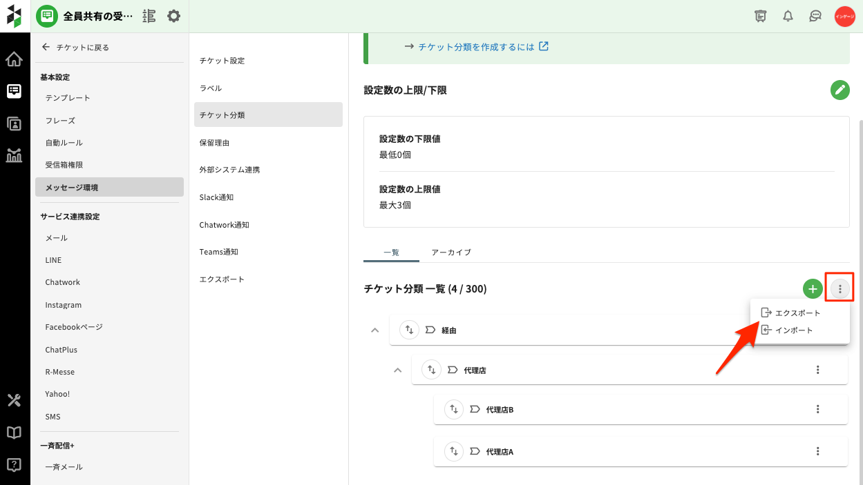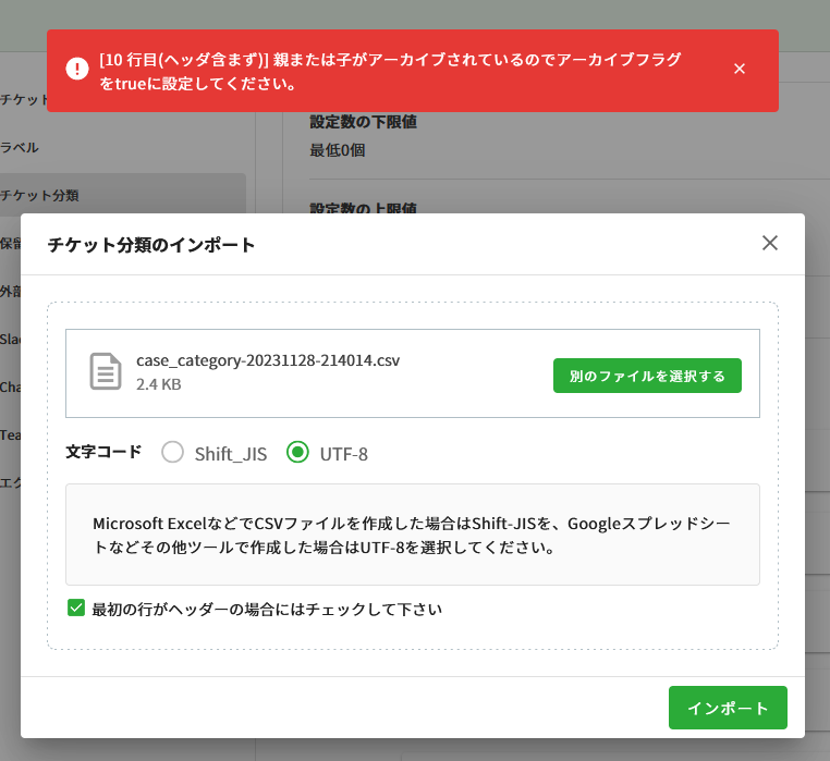 チケット分類をCSVインポートする際に、既存のチケット分類をアーカイブすることができます。