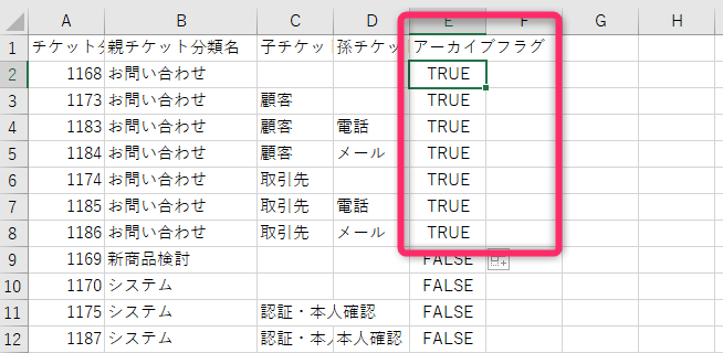 2.アーカイブしたいチケット分類の、「アーカイブフラグ」の列に「TRUE」と入力します。