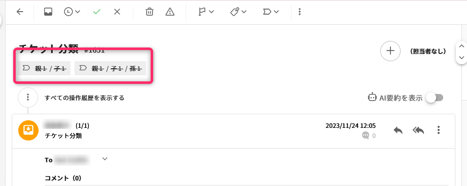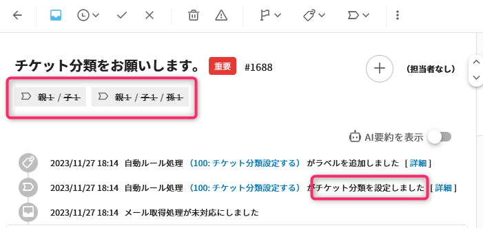 2.アーカイブ済みのチケット分類が自動ルールに設定されていた場合、自動ルール適用時にはアーカイブ済みのチケット分類が付与されます。