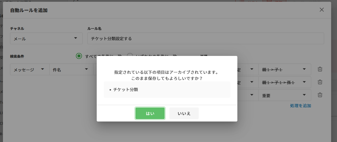 1.アーカイブ済みのチケット分類がルールから削除されることはありません。ただし編集し保存する際に注意を促すダイアログが表示されます。