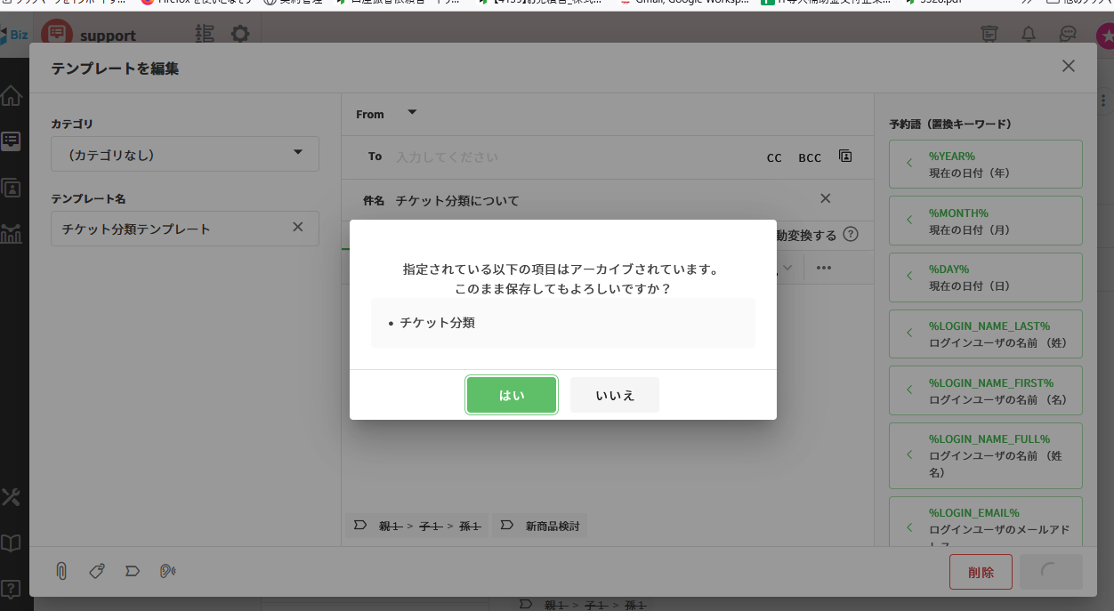 1.アーカイブ済みのチケット分類がテンプレートから削除される事はありません。ただし編集し保存する際に注意を促すダイアログが表示されます。