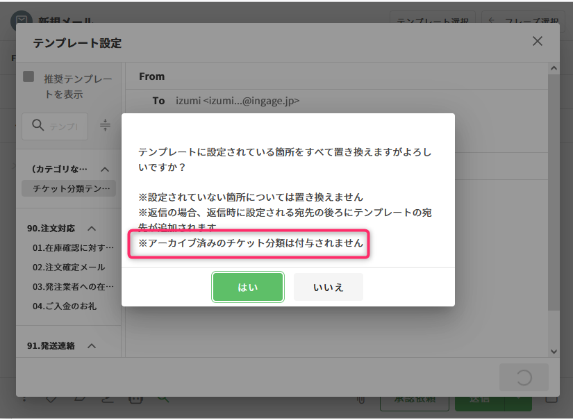 2.テンプレートにアーカイブ済みのチケット分類が設定されていた場合、チケットには付与できません。