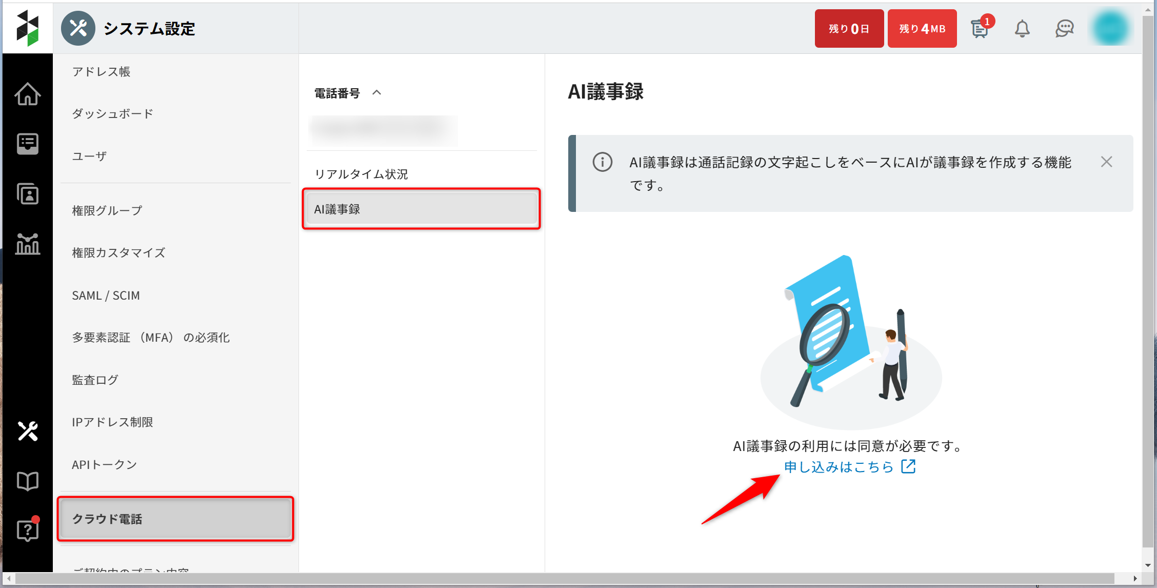 ご利用の際は、[システム設定]>[クラウド電話]>[AI議事録]の「お申し込みはこちら」からお申し込みください。