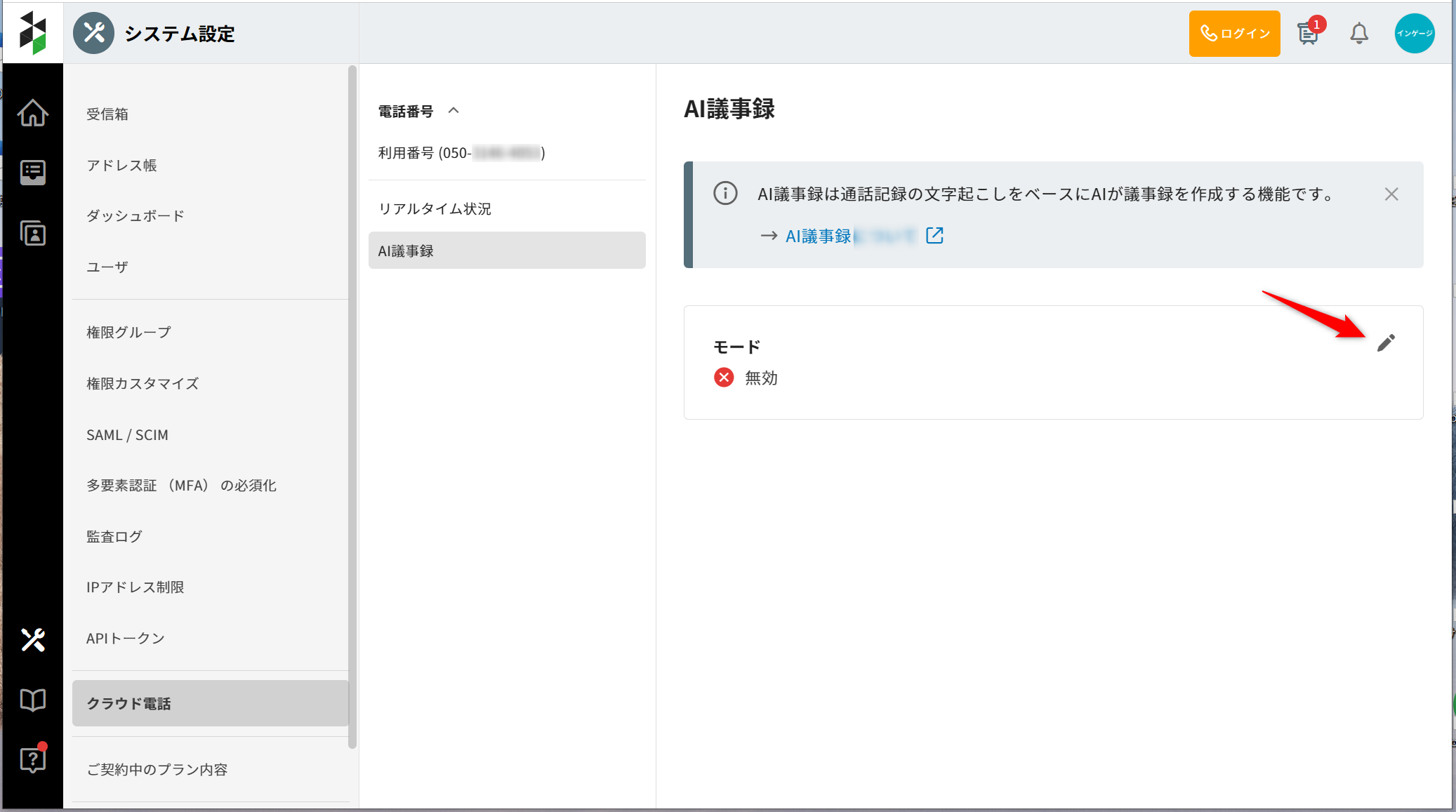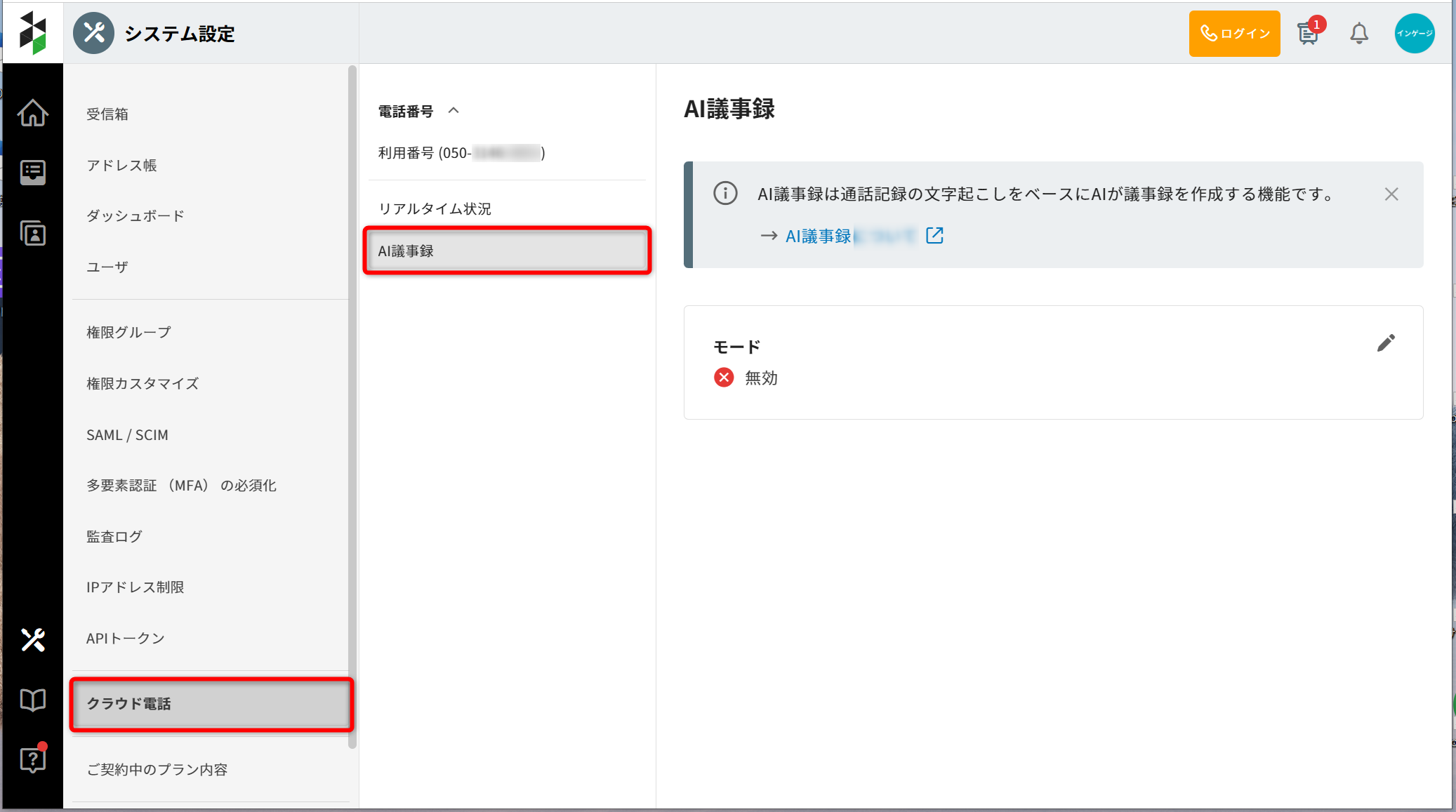1.[システム設定]>[クラウド電話]より[AI議事録]を選択します。