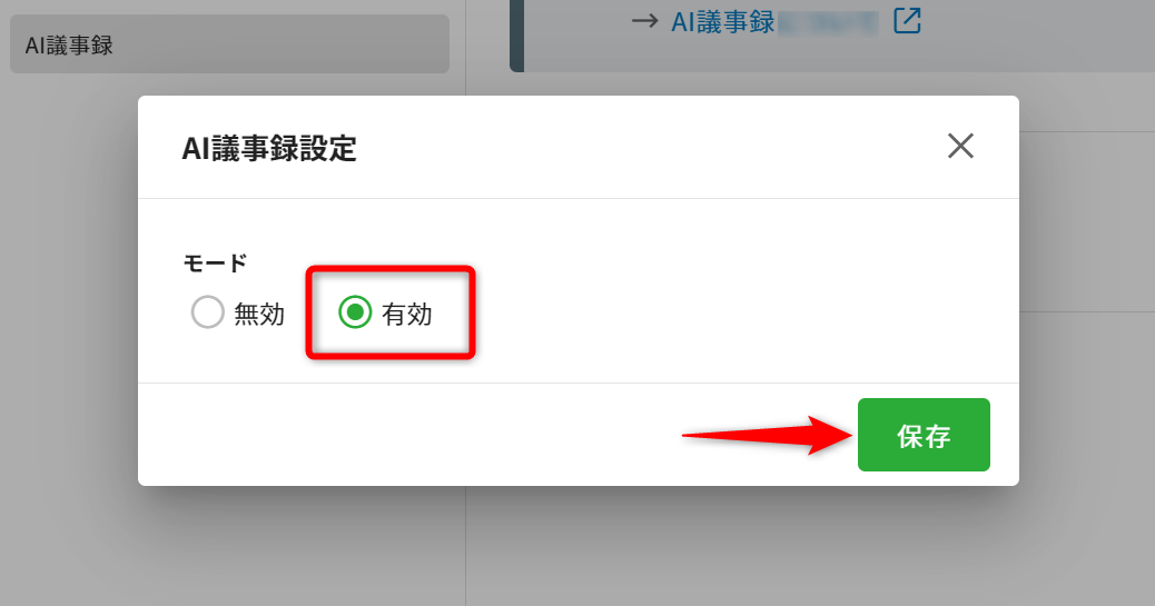 3.[有効]を選択し、保存します。AI議事録を確認するにはAI議事録を有効にすると、それ以降の通話メモにてAIが生成した議事録が表示されるようになります。