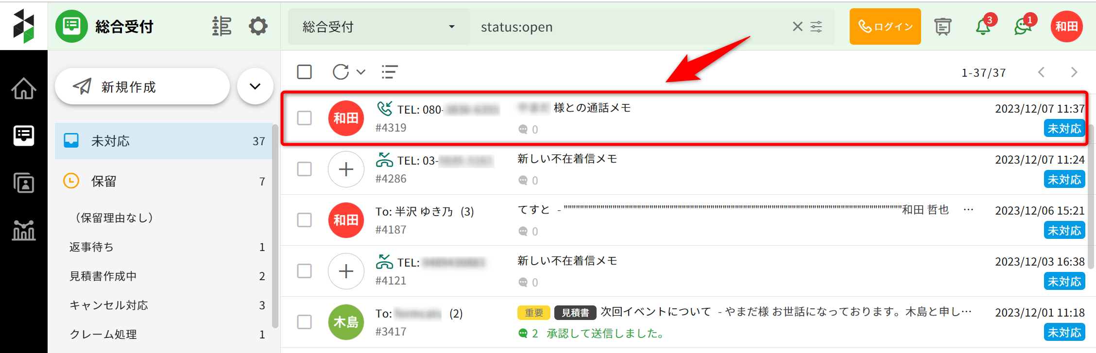 1.チケット一覧にて、クラウド電話の通話メモがあるチケットを選択します。