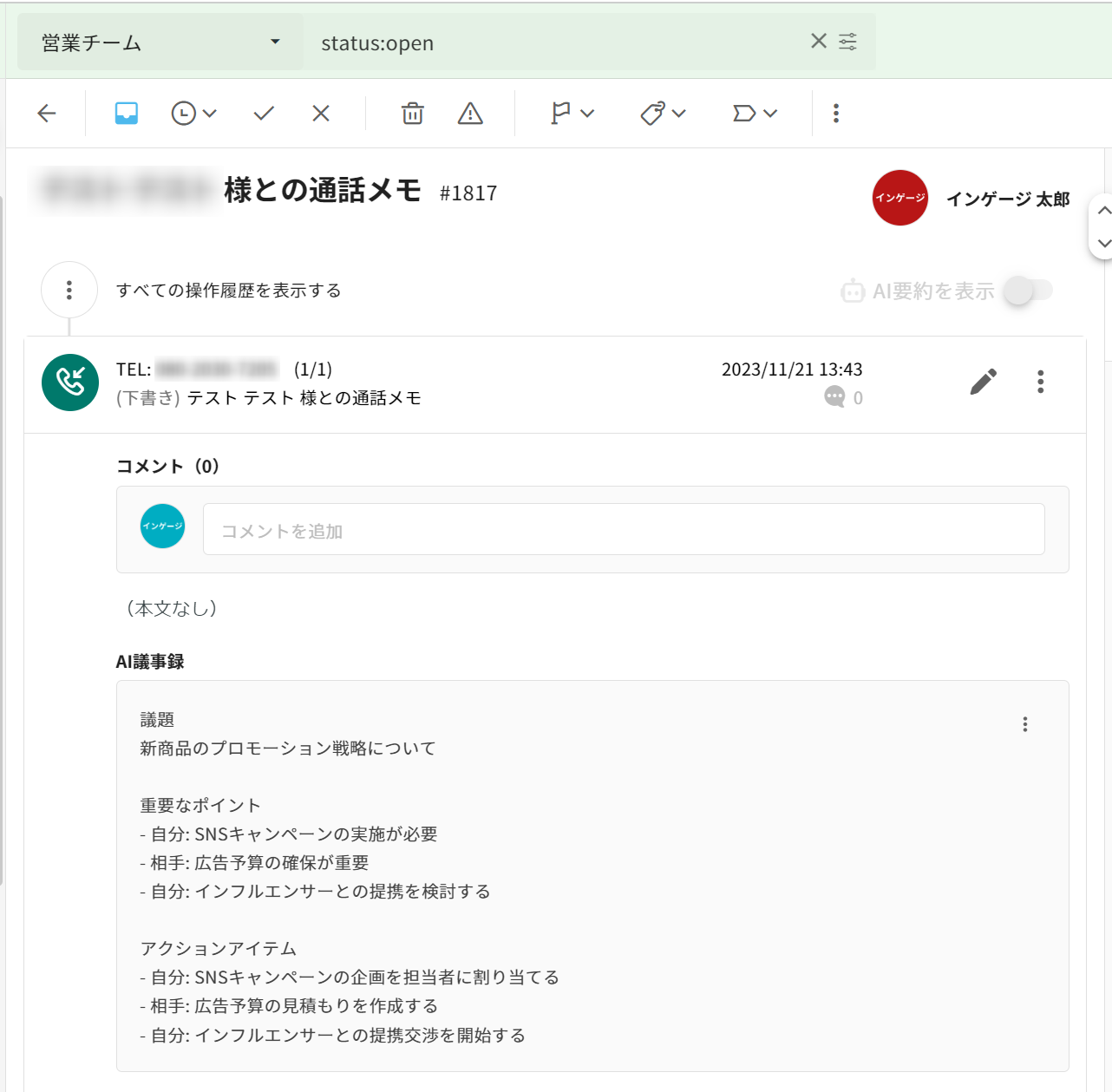 ・不在着信チケットや、通話がすぐに切断されたチケットの場合、AI議事録は生成されません。