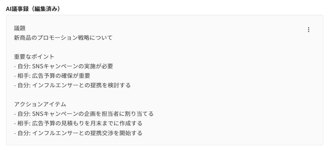 編集して[保存]を押下すると、『AI議事録(編集済み)』と表示されます。