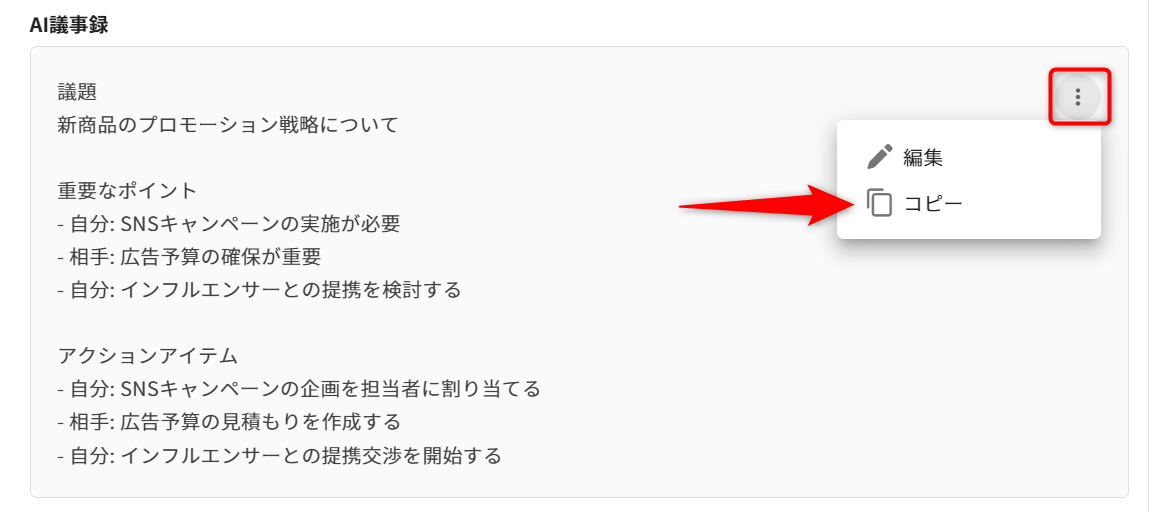 4.メニューアイコンより[コピー]を選択すると、議事録の内容をコピーすることが可能です。