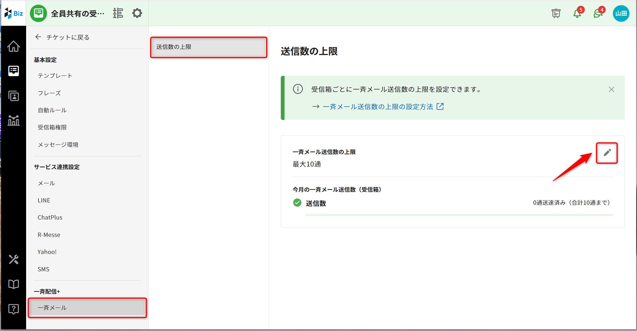 2.[一斉メール]-[送信数の上限]を選択し、右側の鉛筆アイコンをクリックします。