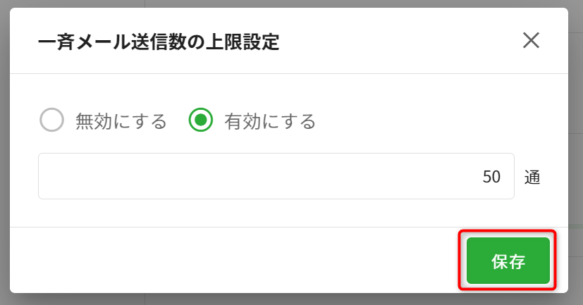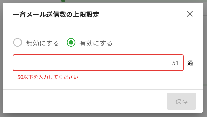 3.送信数の上限を[有効にする]に設定し、任意の数量を入力し[保存]します。