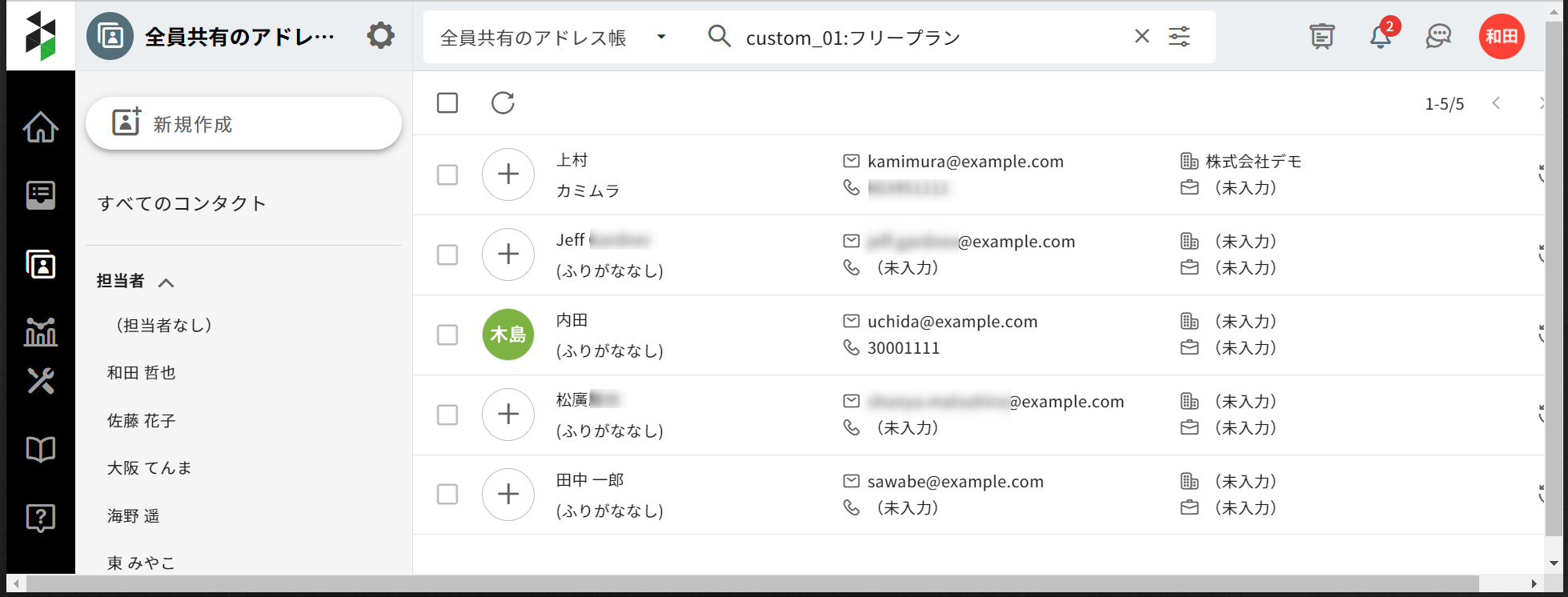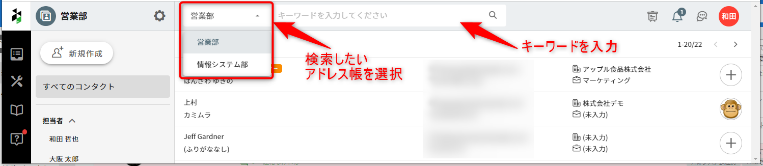 ・コンタクトの登録・更新日時についてコンタクトを検索するにはアドレス帳の上部の検索窓にて、コンタクトの検索が可能です。