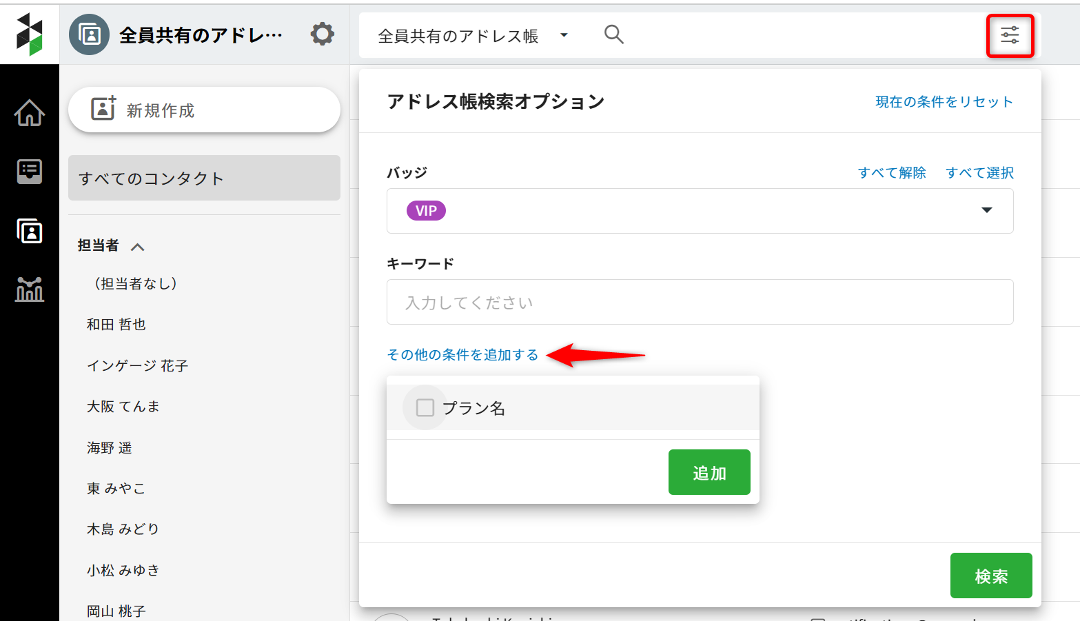 カスタム項目を条件に指定したい場合は、[その他の条件を追加する]をクリックすると条件を追加できます。複数のコンタクトを一括操作するにはコンタクト一覧にて、各コンタクトの左端にあるチェックボックスにチェックを入れると、コンタクトを複数選択できます。