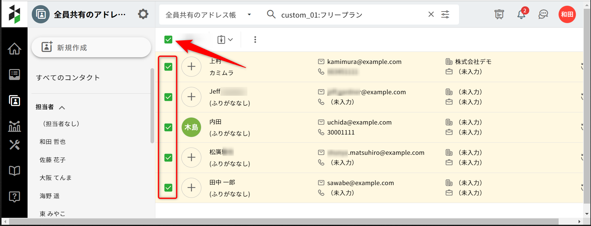 2.検索結果のコンタクトを一括で選択するには、左上のチェックボックス▢にチェックを入れます。